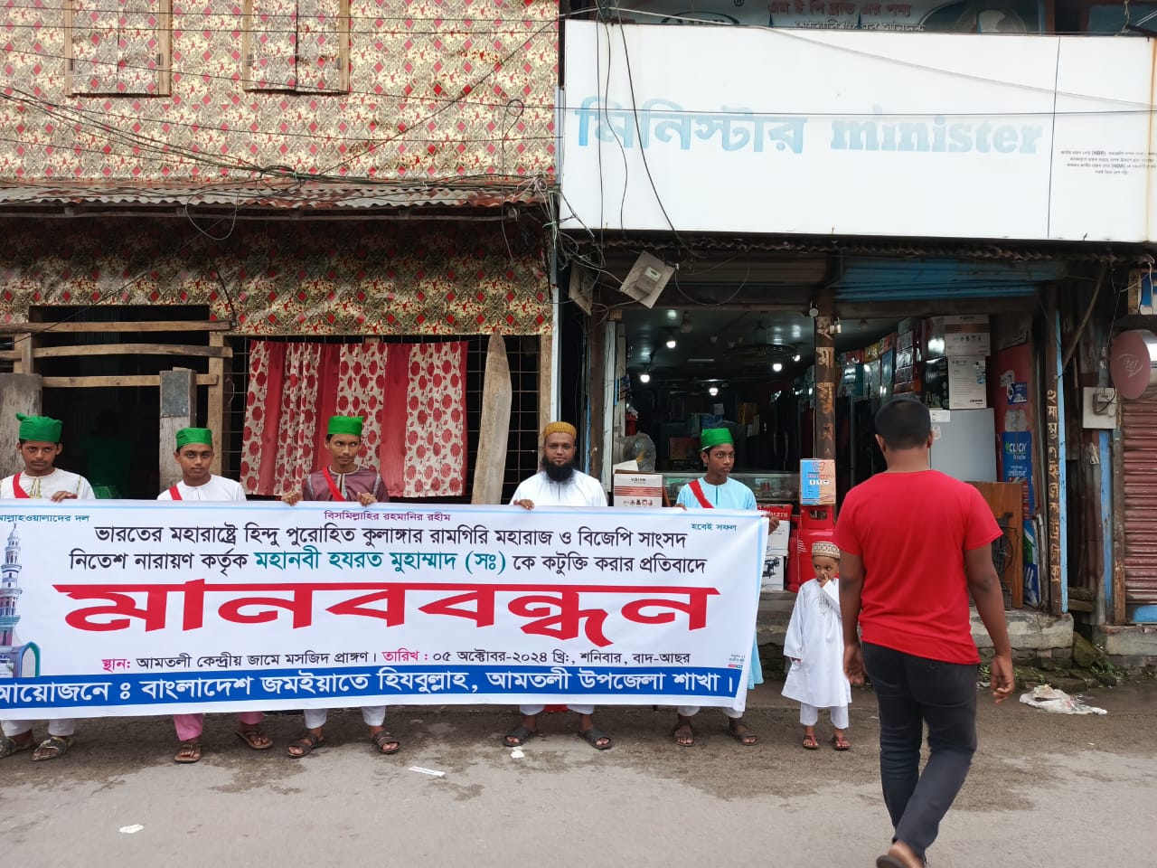 আমতলীতে নবীজিকে কটুক্তি করায় বিক্ষোভ মিছিল ও মানববন্ধন