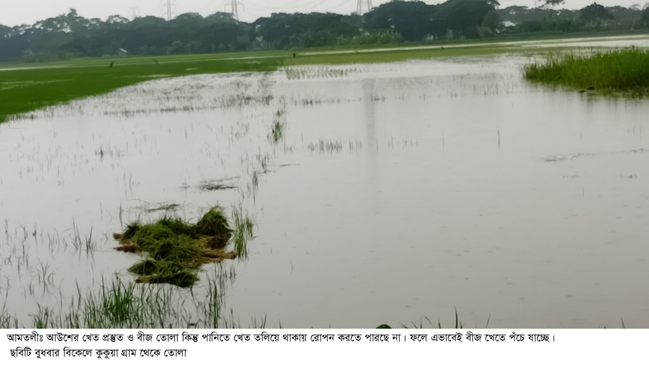 ভারী বৃষ্টিতে আমতলীতে জলাবদ্ধতা। আউশের খেতে বীজ রোপন বন্ধ